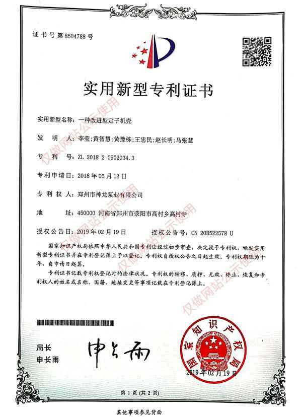 定子机壳专利证书