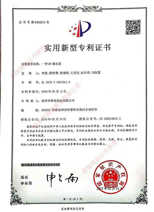 QY潜水泵专利证书